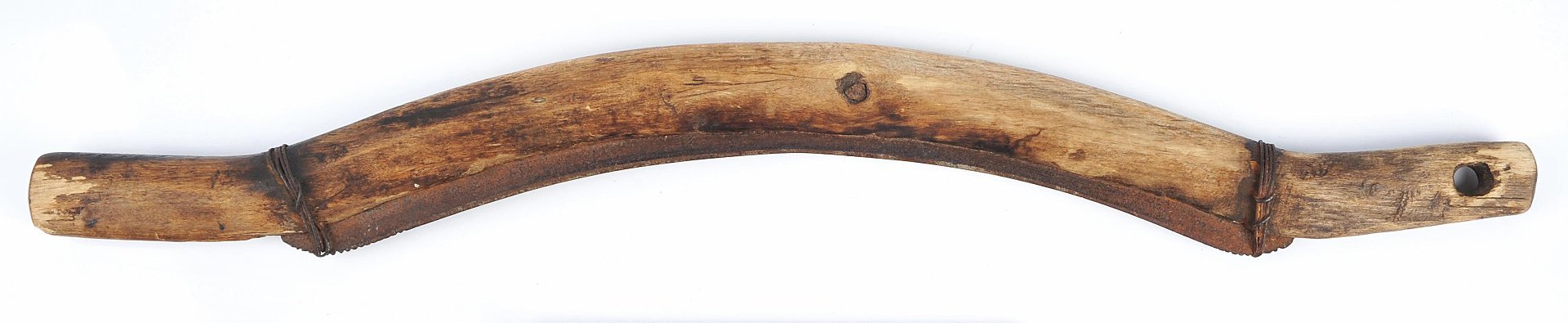 Скребок из дерева и железа. Состоит из двух частей – рукоятки и лезвия. Рукоятка двухсторонняя, изготовлена из цельного куска дерева, вырезана из дощечки в виде пологой дуги с отогнутыми концами. Рукоятка плоская, в сечении эллипсовидная. В одном из концов проделано большое круглое отверстие. С одной стороны рукоятки вырезан узкий глубокий паз, в который вставлено лезвие. Лезвие выполнено кузнечной ковкой в форме длинной вогнутой железной пластины, заточено с двух сторон. Края пластины закруглены, на них имеются мелкие округлые зубцы. Для прочности лезвие с двух сторон прикручено к рукоятке тонкой проволокой в четыре витка.