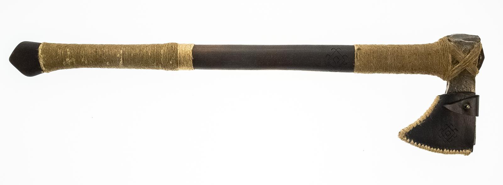 Топорище деревянное темного цвета. В месте соединения топора с топорищем обвязка джутовым шпагатом крест-накрест, в нижней части также обмотка шпагатом. Чехол чёрного цвета, на топорище и чехле вырезан языческий символ. Для обработки дерева мастер использовал «по старинке» льняное масло.
