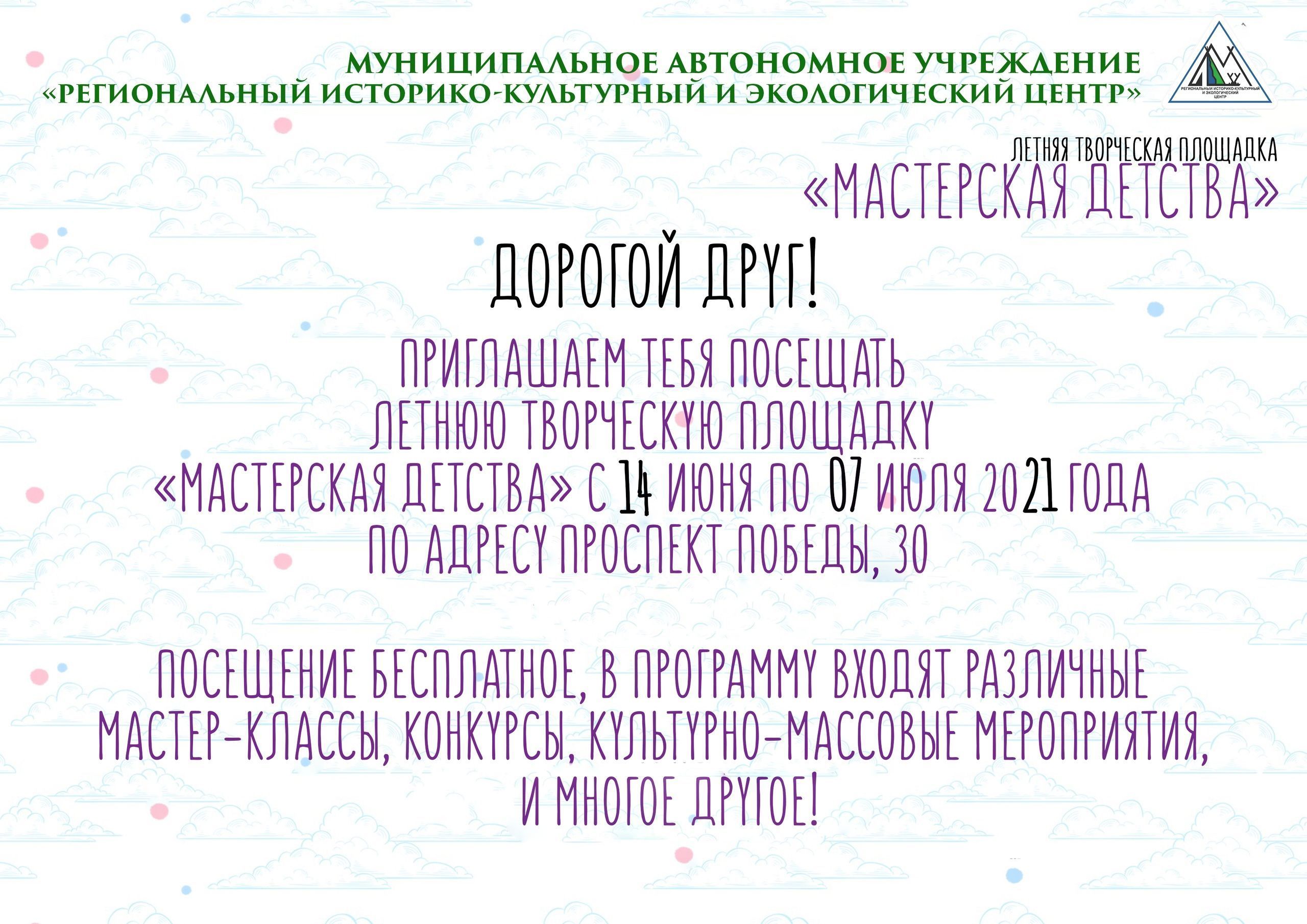 Дорогие друзья! #летняяплощадка Каждый год на базе учреждения «Региональный историко-культурный и экологический центр» организовывается летняя творческая площадка «Мастерская детства», не стал исключением и этот год. Мы приглашаем посетить нашу летнюю творческую площадку «Мастерская детства», которая откроет свои двери в июне этого года по адресу: проспект Победы, 30. Ждем ребят, которые интересуются творчеством и любят учиться чему-то новому! 1 смена начнет свою работу с 14 июня по 07 июля 2021 года! Подробности по телефону 8 (34643) 2-28-05