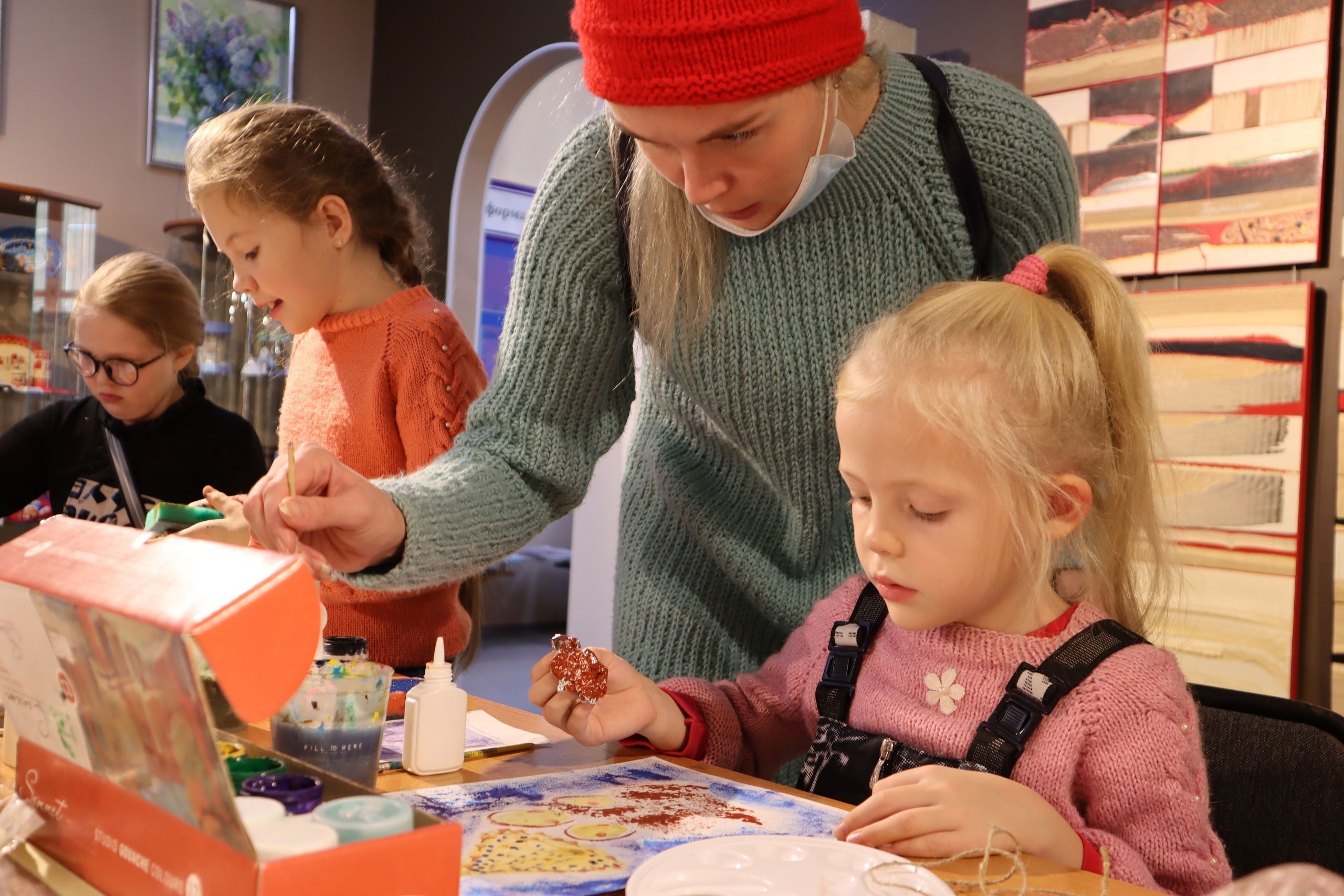 В музейном фонде Экоцентра хранится множество картин на различные тематики, это и натюрморты, и пейзажи, и портреты. Мы выбрали некоторые из них: Игошев В.А. «Мансийские дети», Шлябин Д.Д. «Зимовье», Бондаренко А.Ю. «Маки», Мухаметова А.Ф. «Шаман», и предложили ребятам воссоздать эти произведения искусства с помощью предложенных материалов и с помощью нестандартных техник рисования.