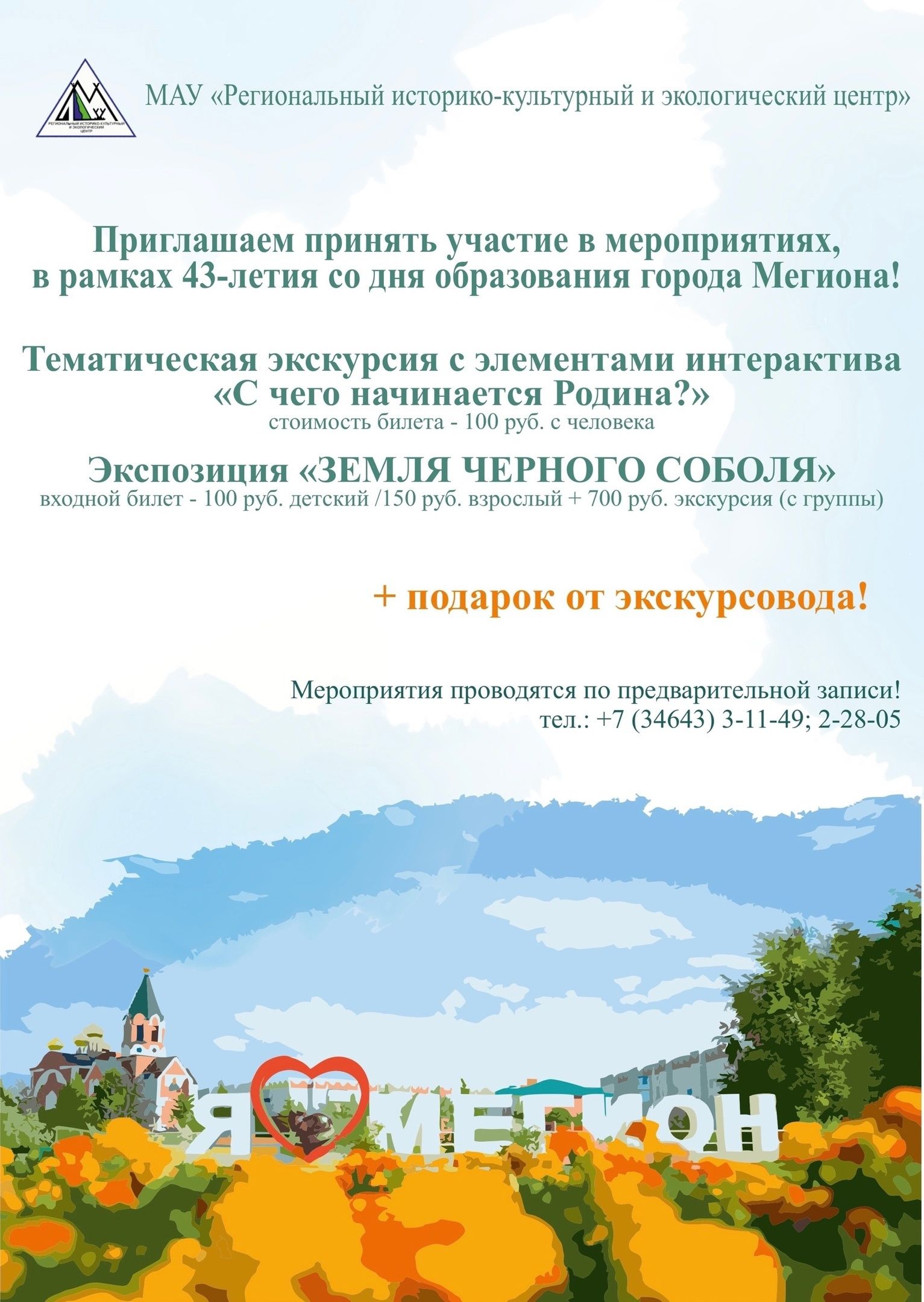 В честь дня города – 43-летия Мегиона, экскурсоводы МАУ «Экоцентр» проводят тематические экскурсии «С чего начинается Родина?» и экскурсии по экспозиции «ЗЕМЛЯ ЧЕРНОГО СОБОЛЯ».